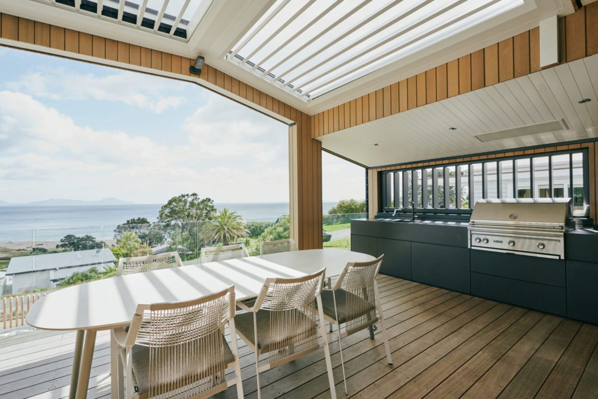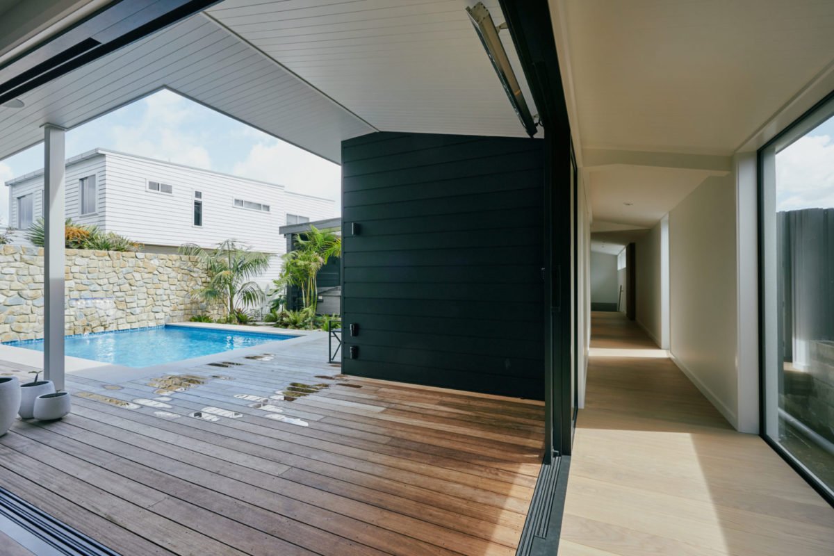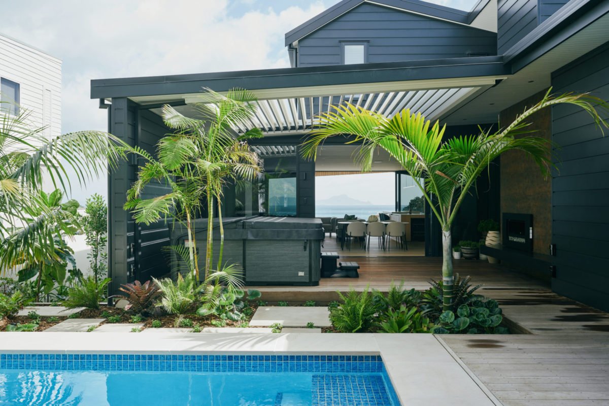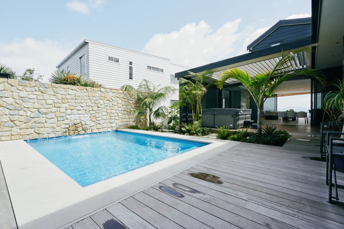 Sitting proudly on the hillside overlooking pristine Langs Beach with uninterrupted ocean views, this spectacular home has a real sense of calmness. The use of American Oak on the floors and feature paneling with cool coastal tones throughout, create a luxe resort vibe which is further complemented by the open plan living, seamless indoor/outdoor flow, and retracting louvres. Like many of the homes we have had the privilege of building, there is a stage of evolution, which in this case saw the addition of a plunge pool complete with a feature stone wall, waterfall, and perfectly landscaped gardens, to really create a tropical oasis like no other.