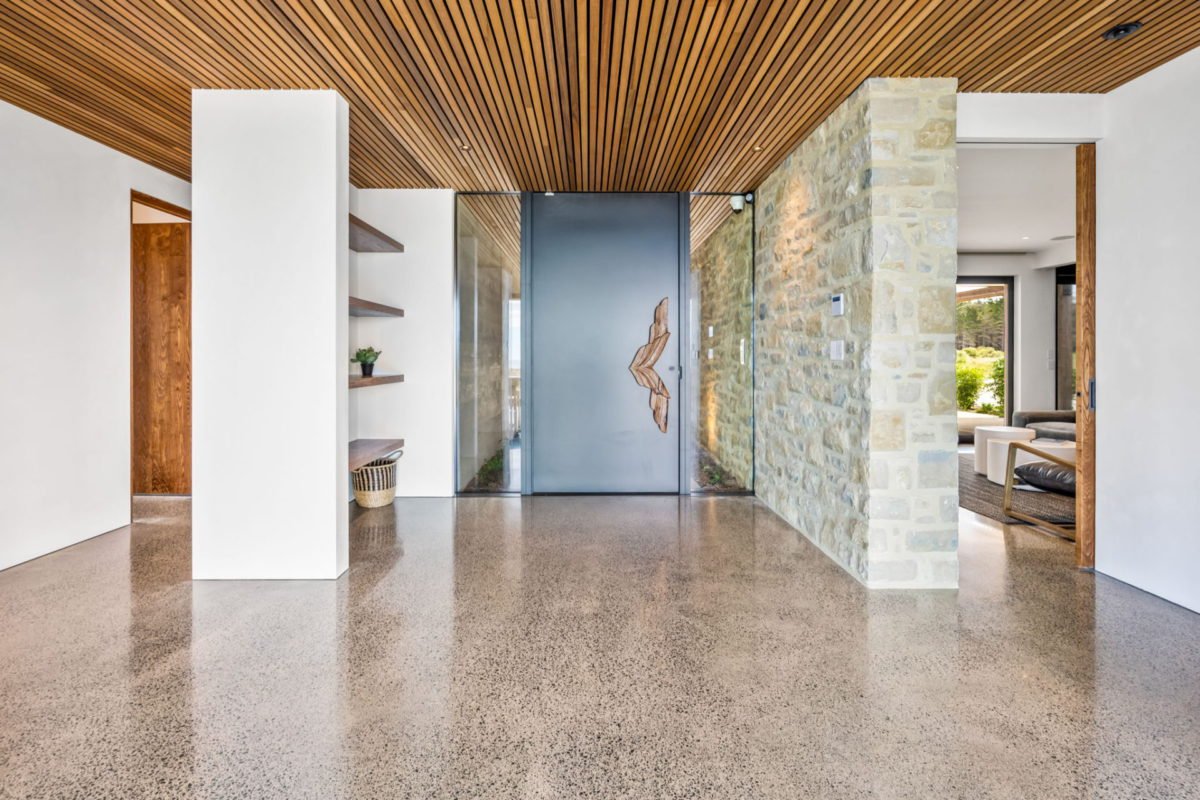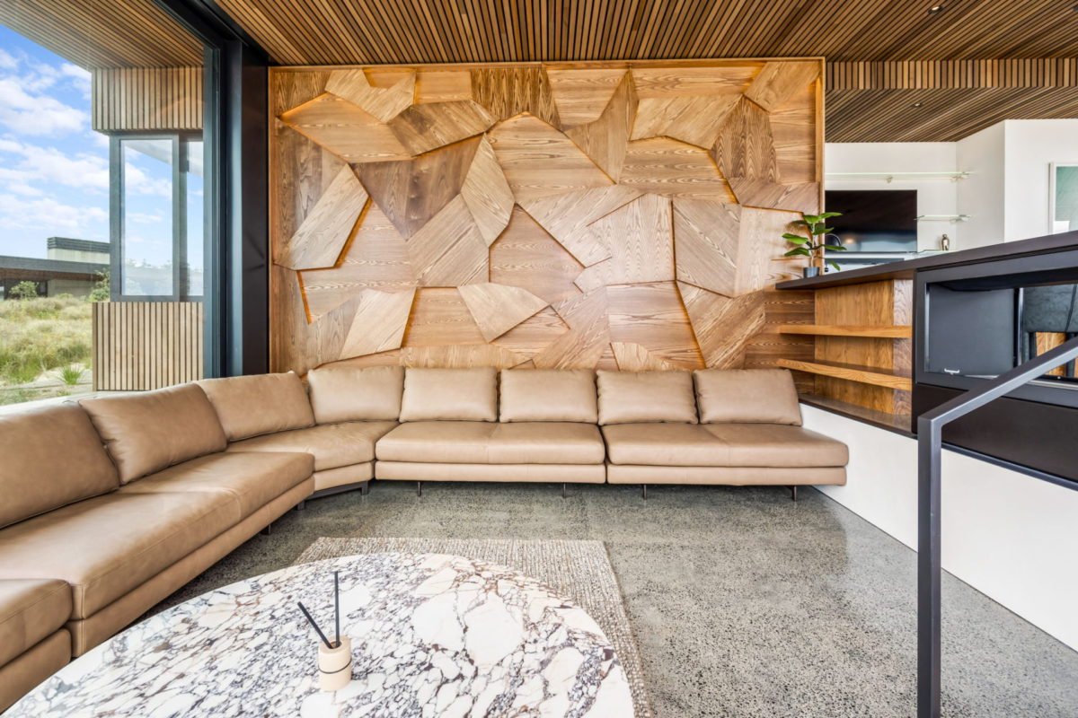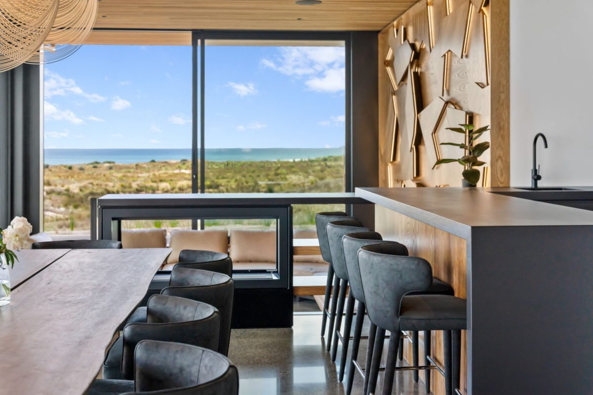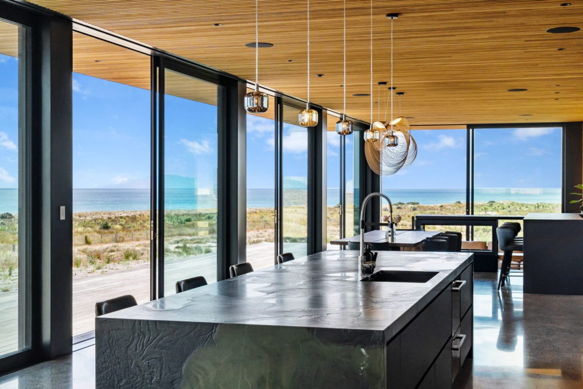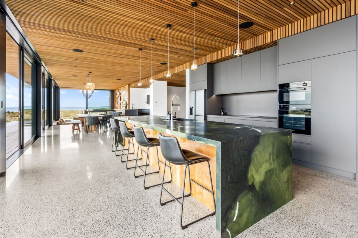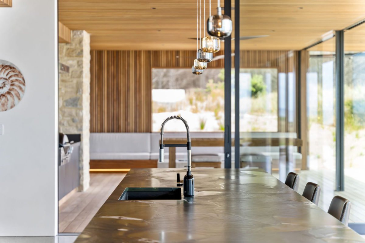Our clients wanted to create a home that complemented the surrounding landscape and environment through a celebration of textures. This is evident in the use of wood, stone, concrete, plaster, and feature lighting throughout the home and exterior cladding. One such stand out feature is the bespoke greenstone-like kitchen island that demands attention as you enter the open plan living/kitchen/dining/bar area.