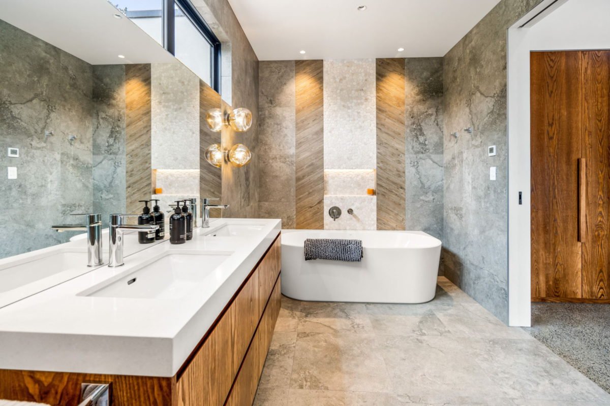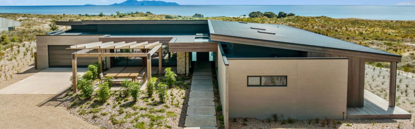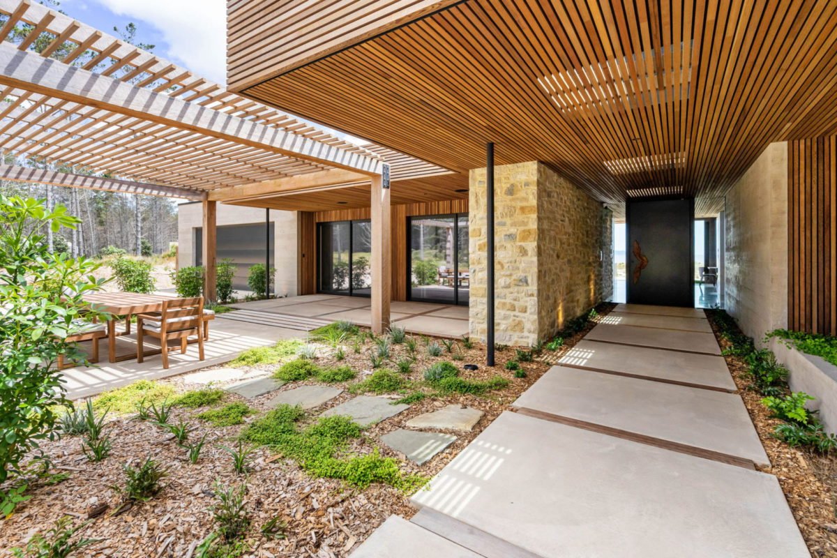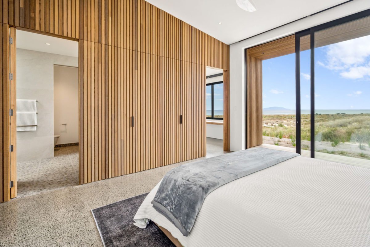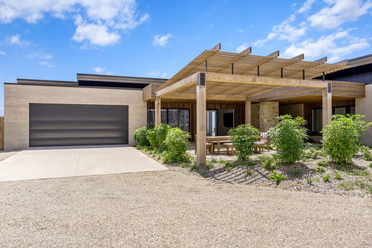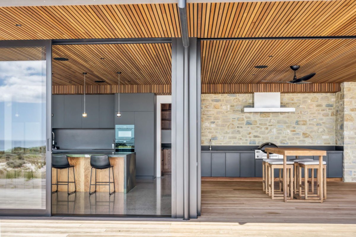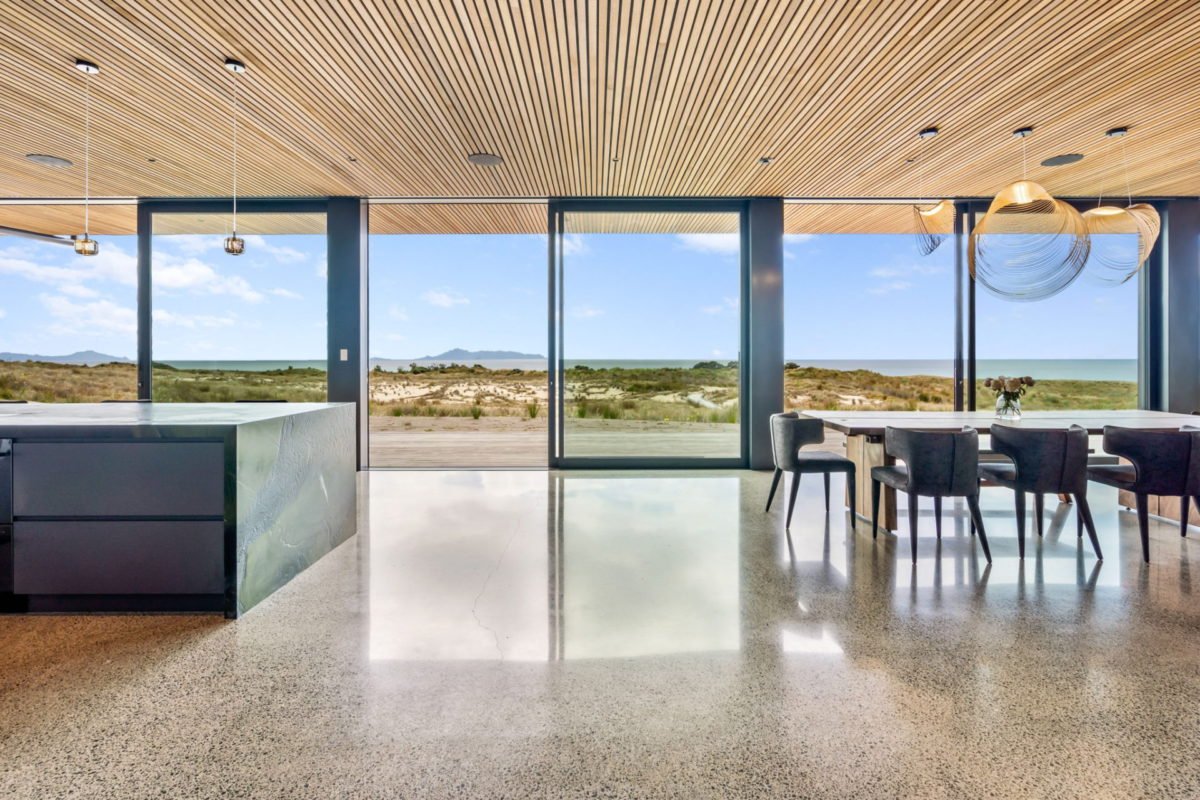 Our clients wanted to create a home that complemented the surrounding landscape and environment through a celebration of textures. This is evident in the use of wood, stone, concrete, plaster, and feature lighting throughout the home and exterior cladding. One such stand out feature is the bespoke greenstone-like kitchen island that demands attention as you enter the open plan living/kitchen/dining/bar area.