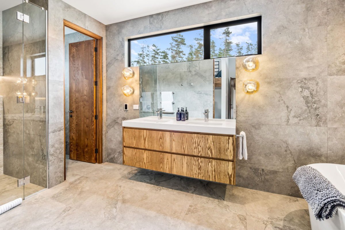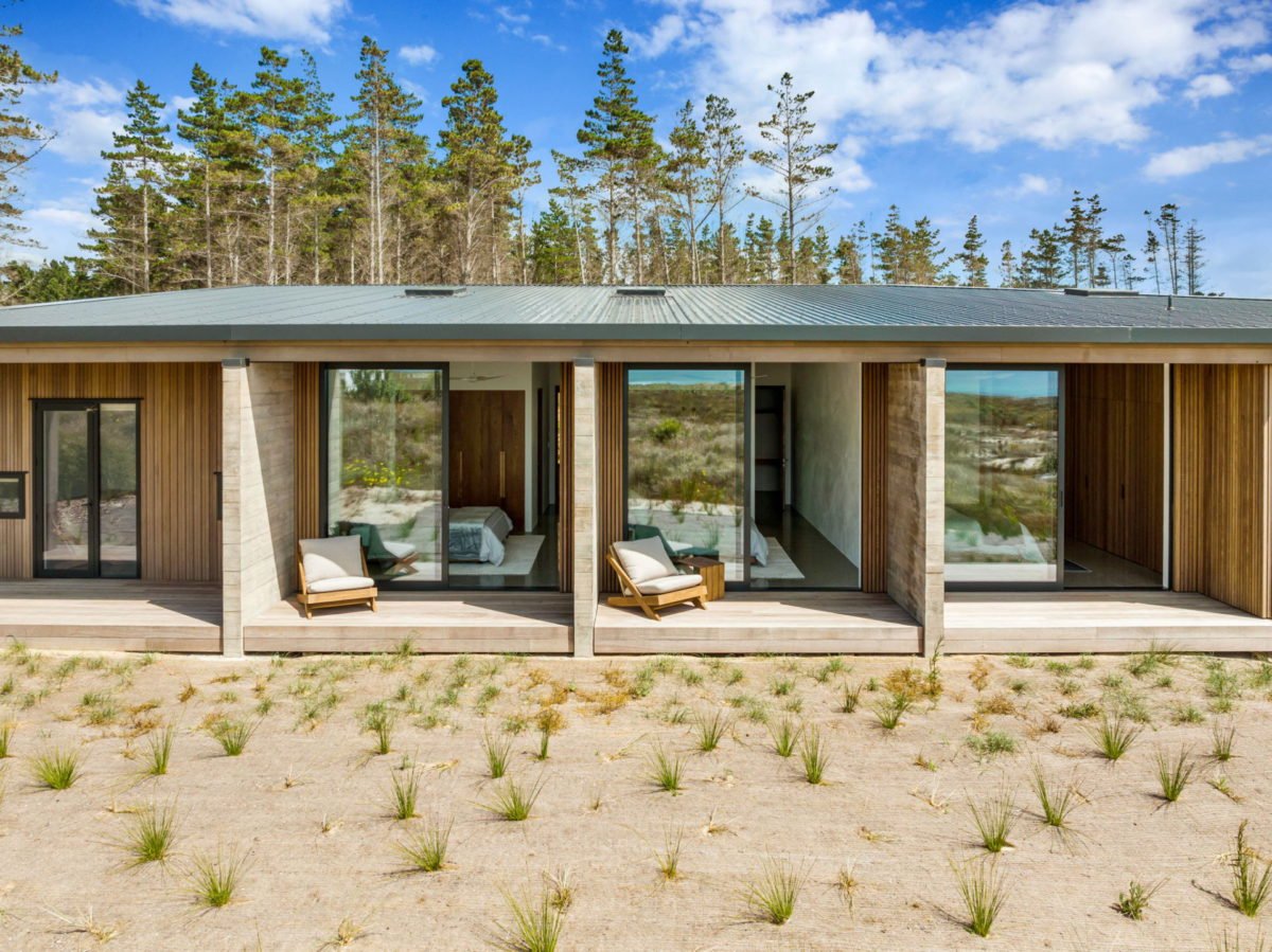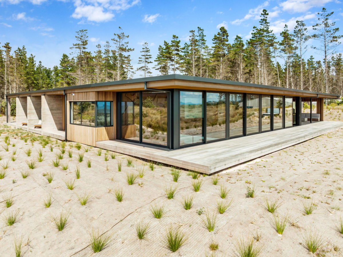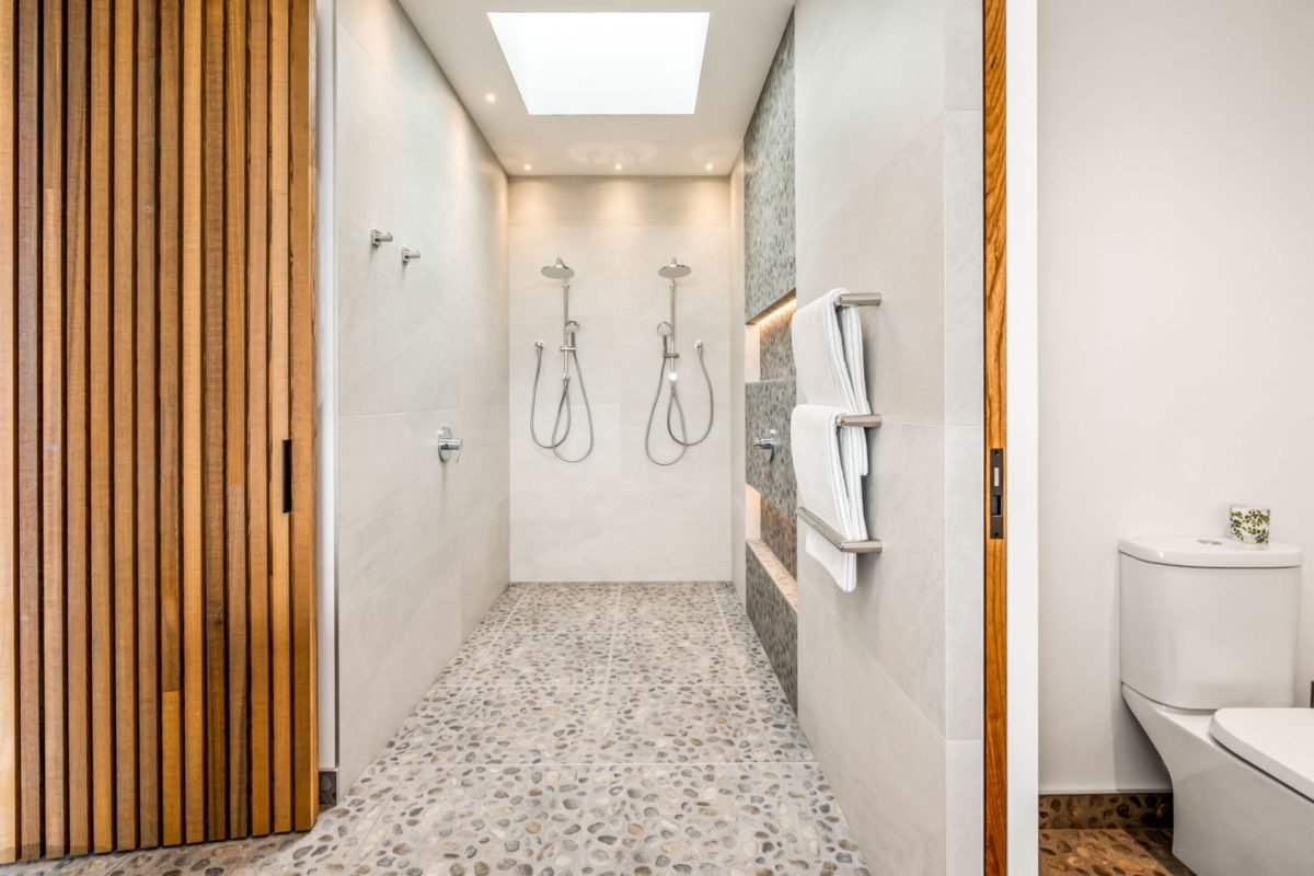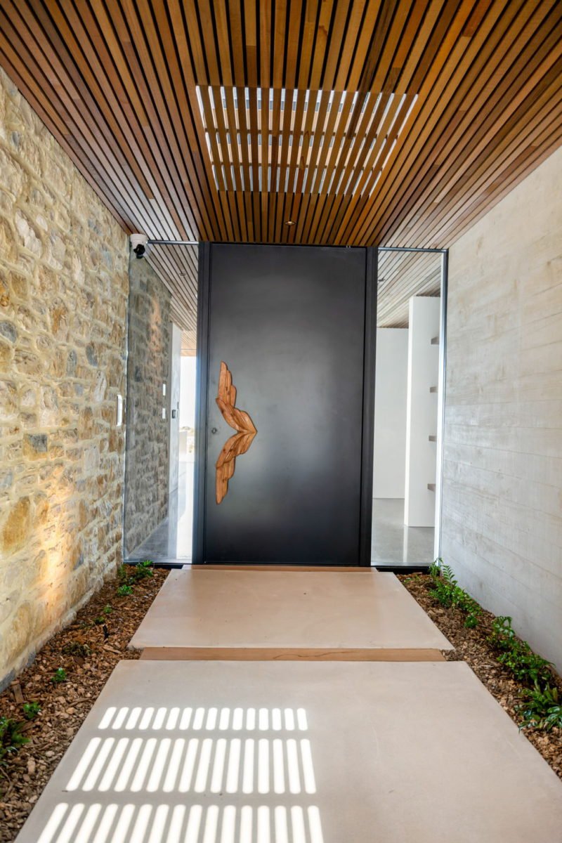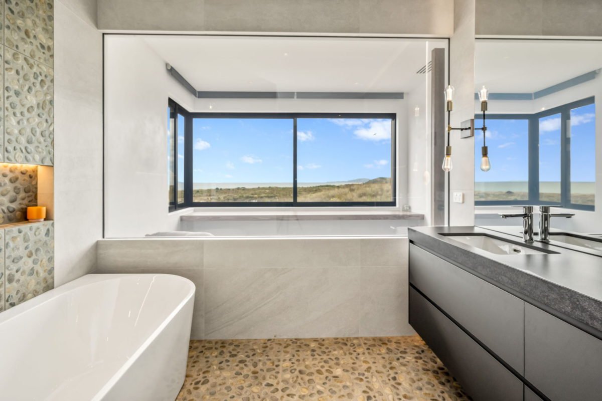 Our clients wanted to create a home that complemented the surrounding landscape and environment through a celebration of textures. This is evident in the use of wood, stone, concrete, plaster, and feature lighting throughout the home and exterior cladding. One such stand out feature is the bespoke greenstone-like kitchen island that demands attention as you enter the open plan living/kitchen/dining/bar area.