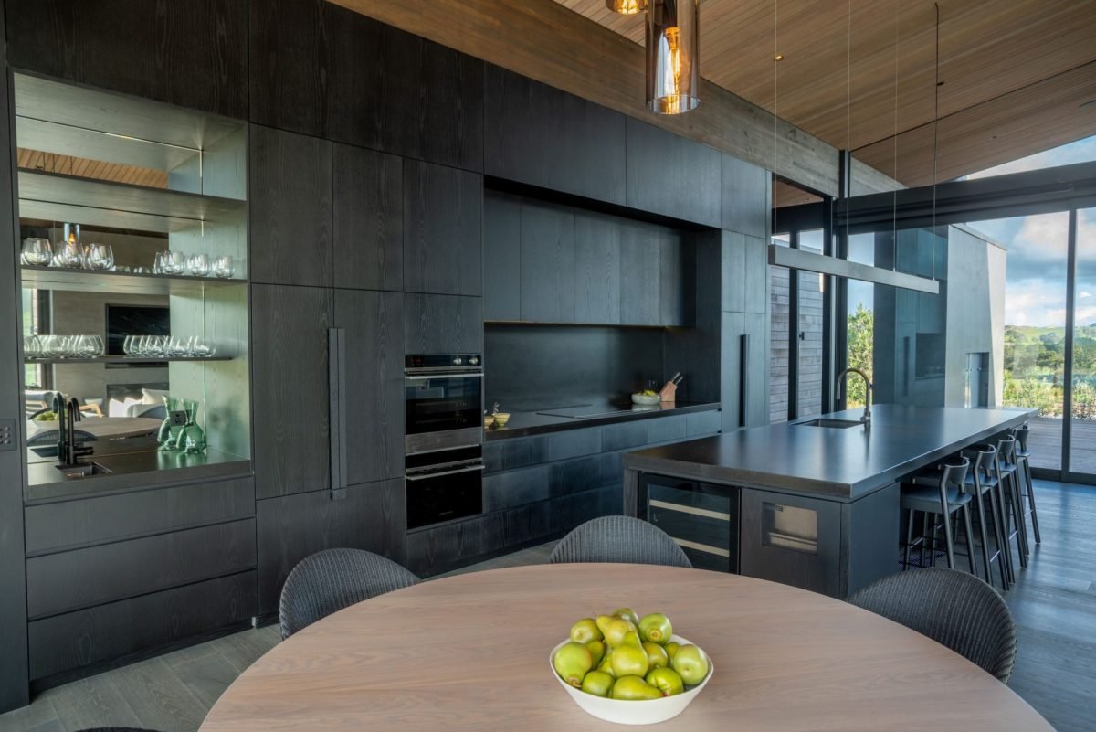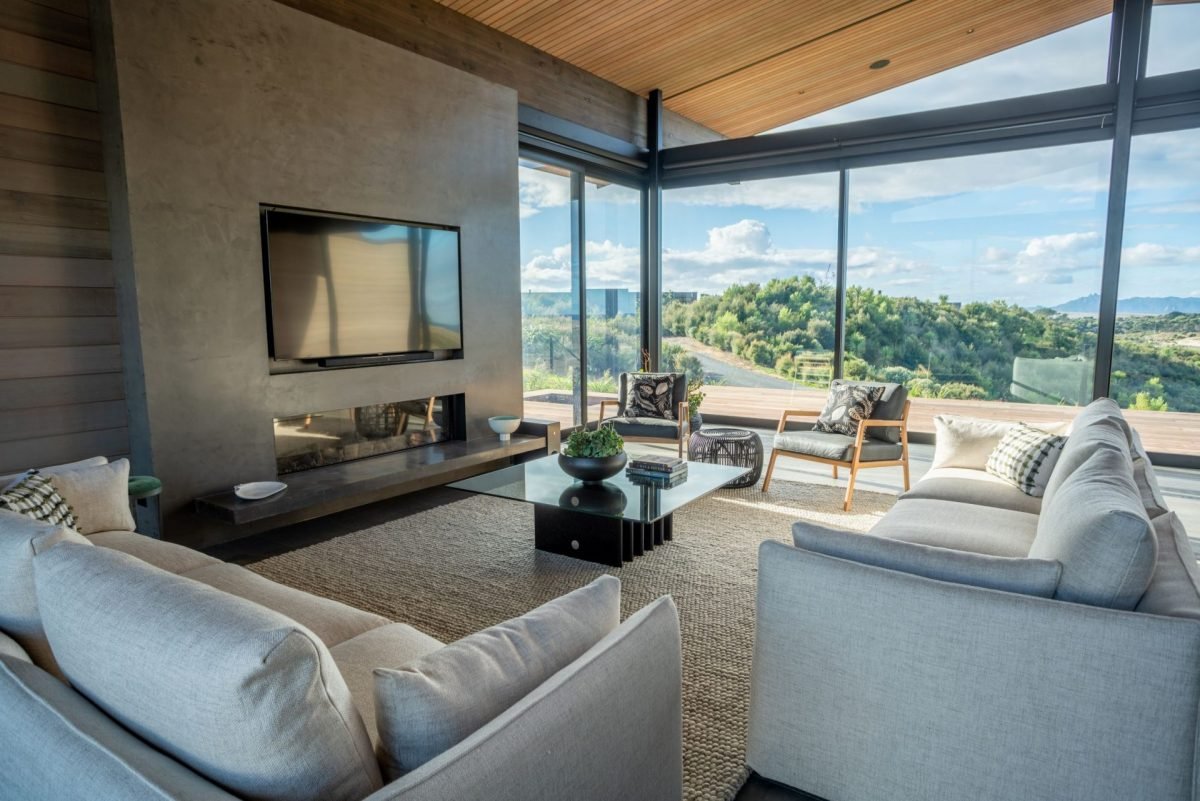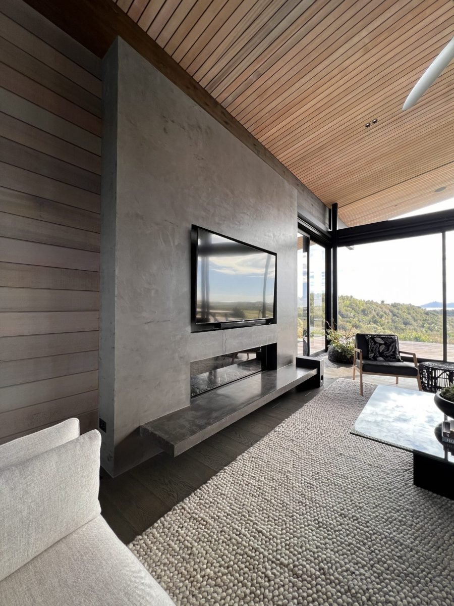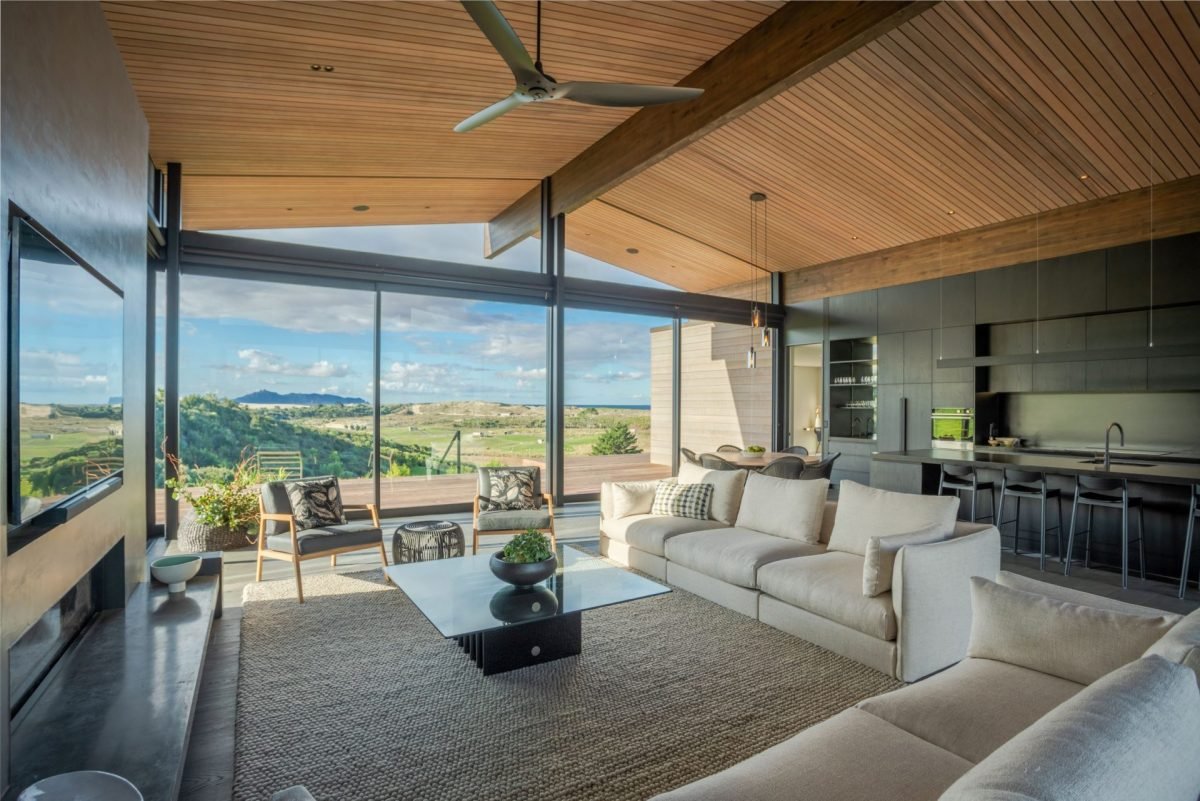 Large sliding doors along the entire front of the main living space frame the uninterrupted ocean and country views while also creating a seamless indoor/outdoor flow to a sweeping deck, complete with in-ground firepit, providing the ultimate entertainer’s dream home.