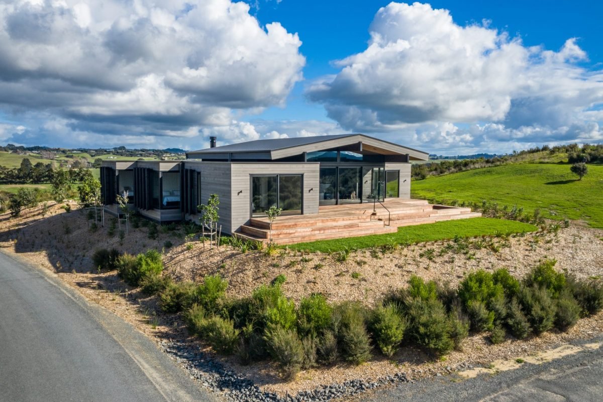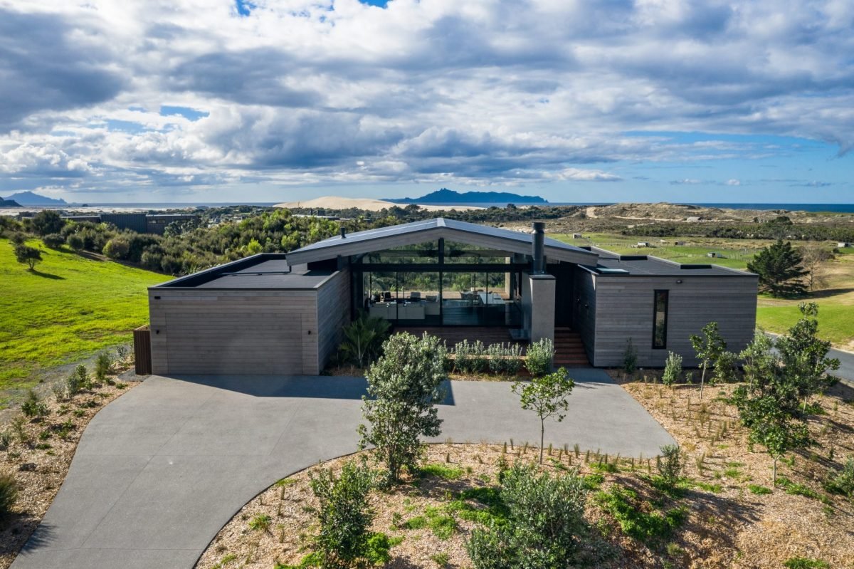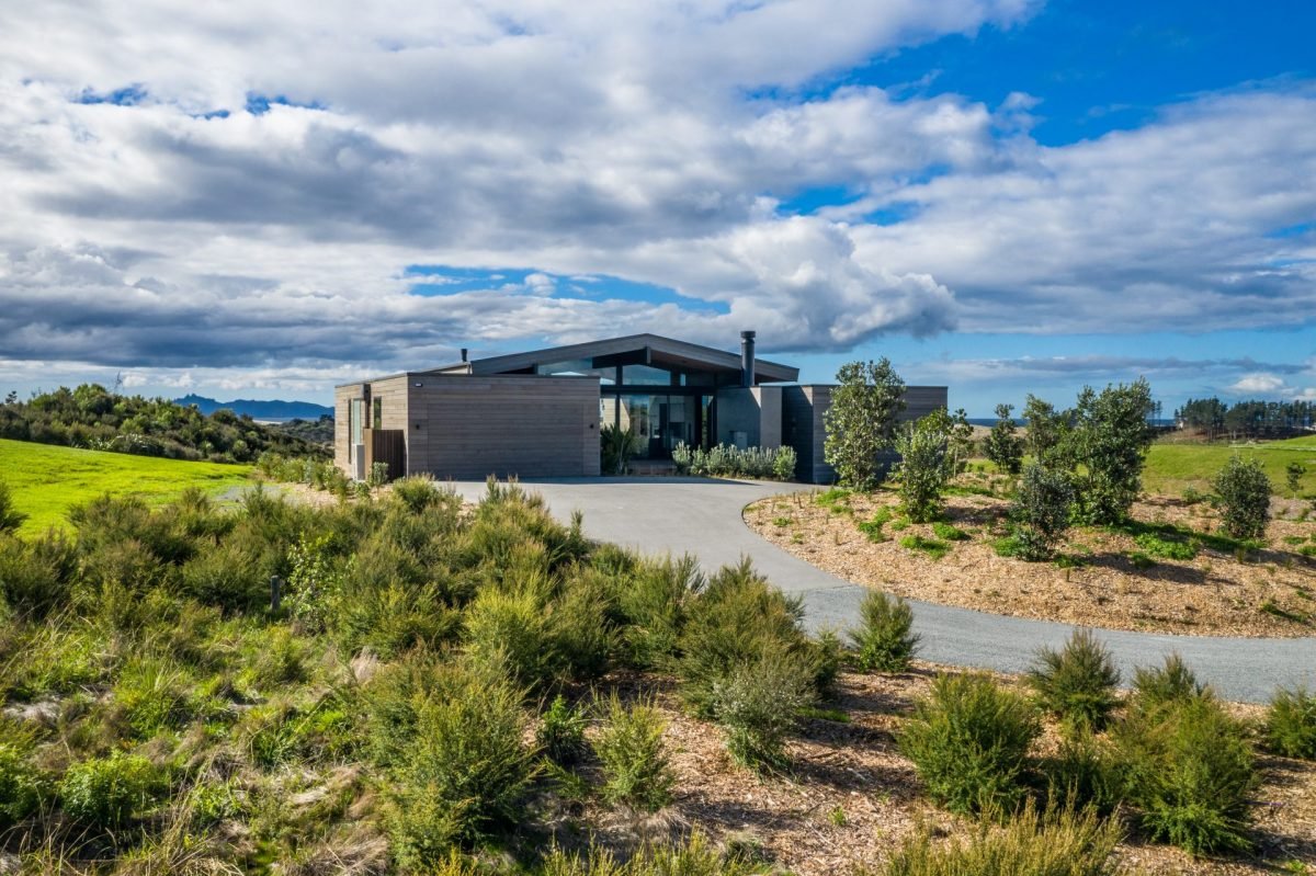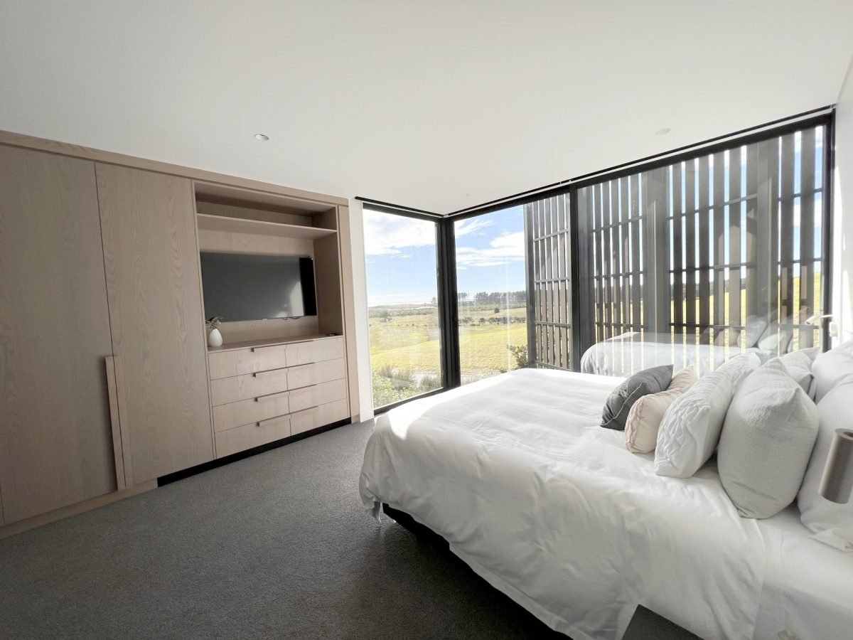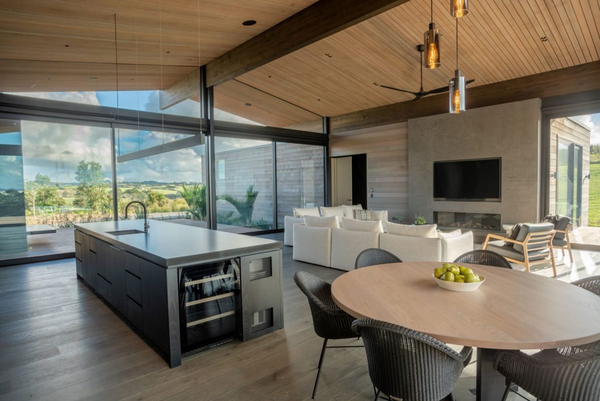 Large sliding doors along the entire front of the main living space frame the uninterrupted ocean and country views while also creating a seamless indoor/outdoor flow to a sweeping deck, complete with in-ground firepit, providing the ultimate entertainer’s dream home.