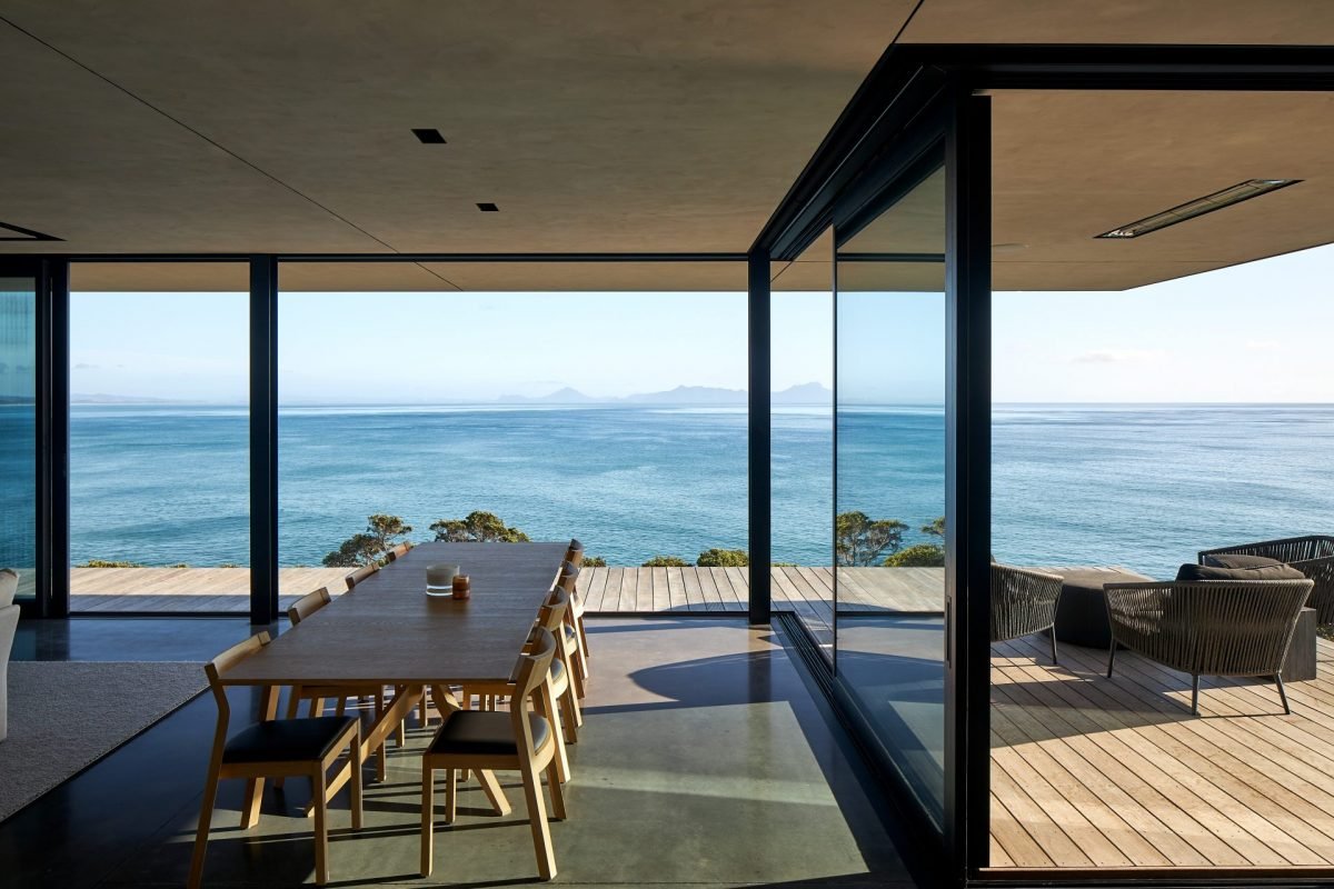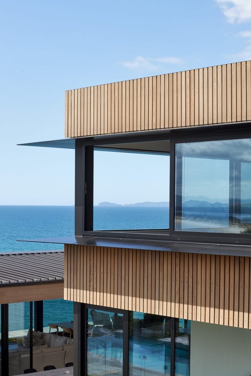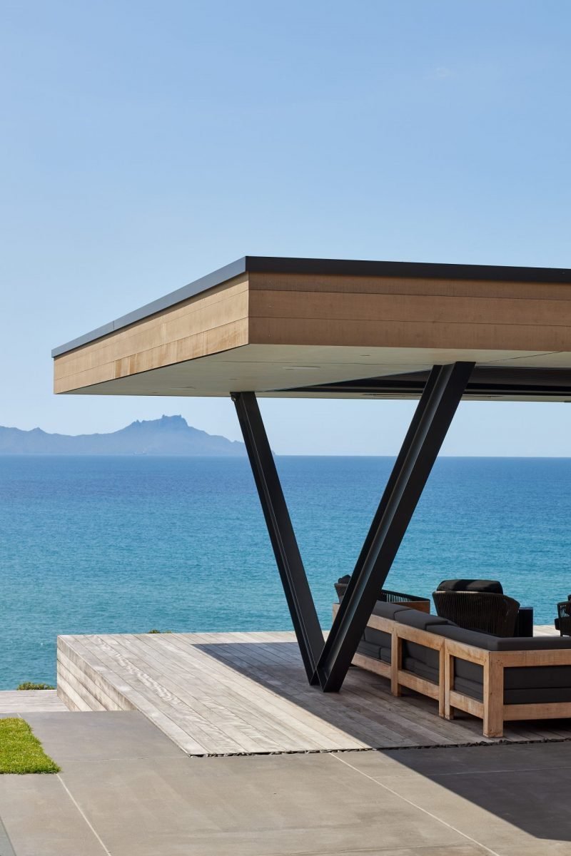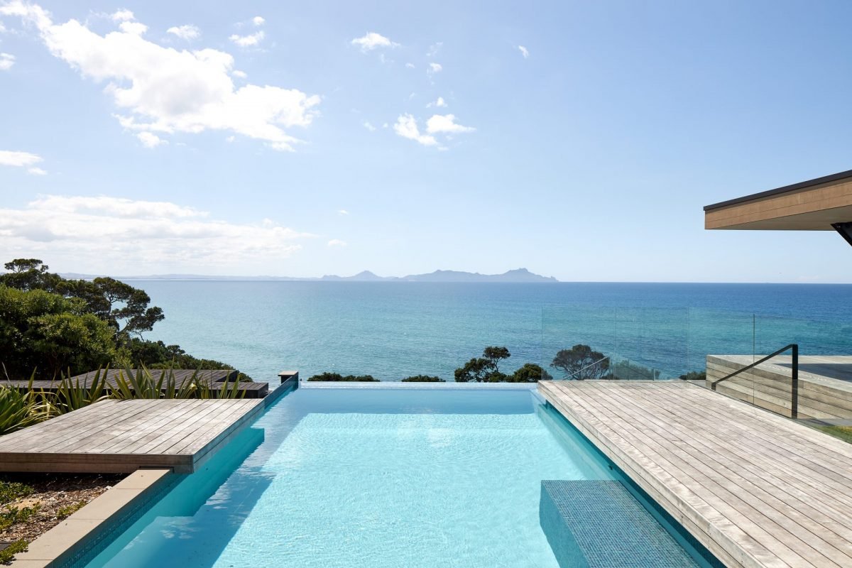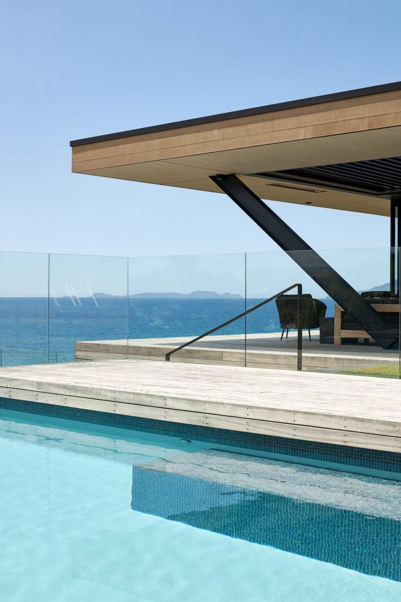 There were considerable earthworks and retaining involved to be able to provide our clients with a sweeping wrap around deck free from any balustrades. The brief also increased to include a swimming pool and spa, which ultimately really brought the whole place together. Standing at the pool it almost feels like the pool is one with the sea.
