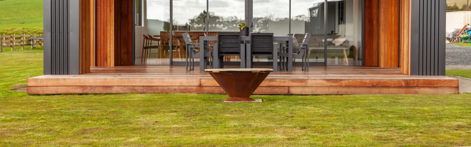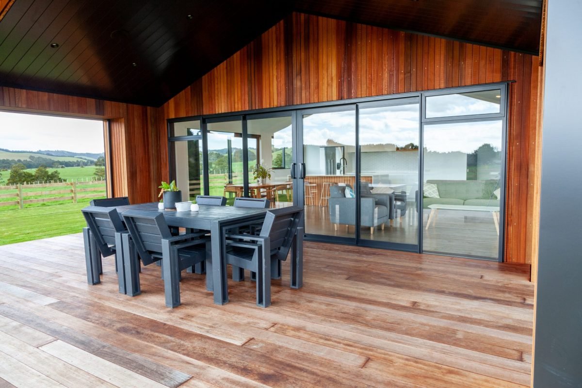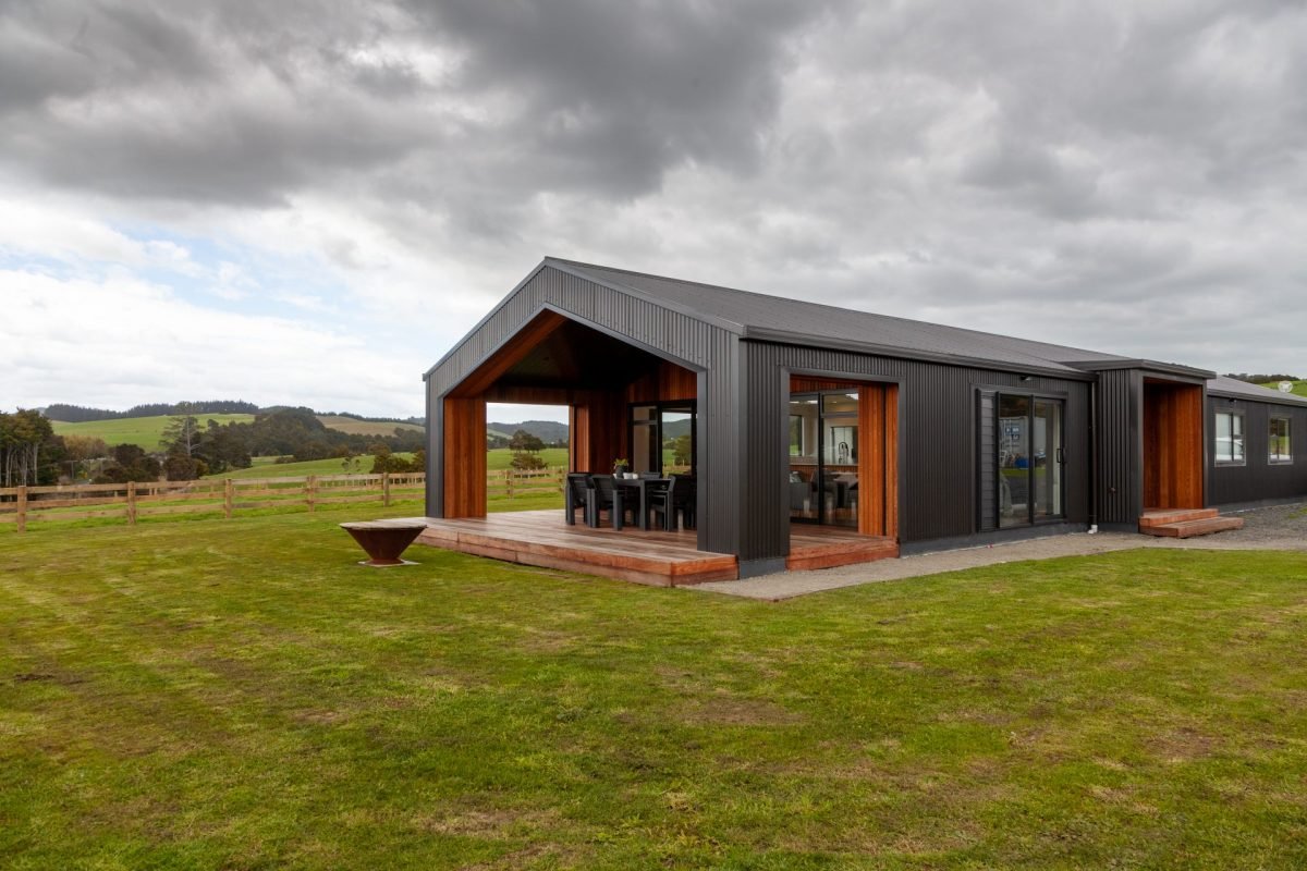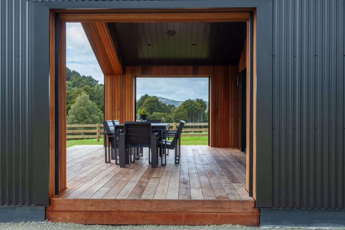 Located in the country it’s hard not to be impressed by the contrast of the black corrugated iron cladding against the rolling green hills and abundance of trees surrounding the home. Additional drama is brought to the design with the large gable roof and cedar panelling, while the covered outdoor area beautifully frames the rural vista just steps away.